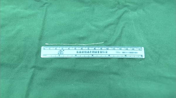 完善术前准备后,郭强为莉莉在全麻下行“左侧枕叶病变切除术”。“术中,我突然听到有像吸面条一样的声音,我判断应该是裂头蚴被吸引器吸进去了。”郭强表示,后来果然在吸引器中发现了一条蜷缩的裂头蚴。经测量,这条裂头蚴竟长达9厘米!