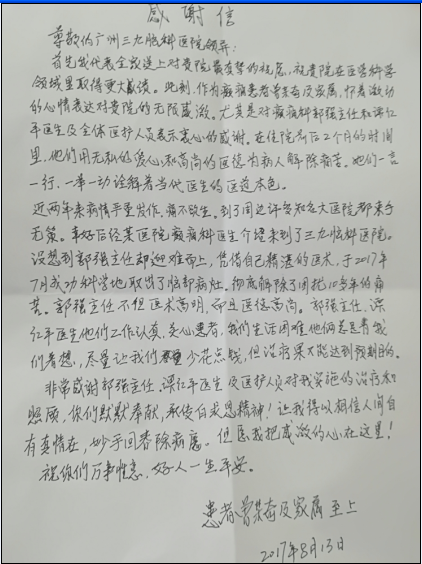 非常感谢郭强主任、谭红平医生及医护人员对我实施的治疗和照顾,你们默默奉献,承传白求恩的精神,让我得以相信人间自有真情在,妙手回春病魔除。但愿我把感激的心留在这里!