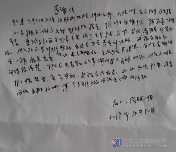 本人是9月23日入住三九脑科医院神经外五科。入院以来,在各领导、医生精心安排下,做了各种针对性检查。9月29日安排手术,手术花费十小时有余。鲁主任与众医生非常辛苦,终于完成手术。术顺,术后清醒,对答如流,进入ICU。受到多方照顾,在这里不会感受到冷眼,就像在自己家里一样。服务态度,说话语气都很好。主治医生卢建侃, 每次查房都询问得很清楚。护士长朱春花经常询问护士服务如何,对应及时度。护士陈珺珺、唐芳照顾,护理方法得当。此外医院非常注重回访, 安排孙晰博不定期做回访各方面的问题。