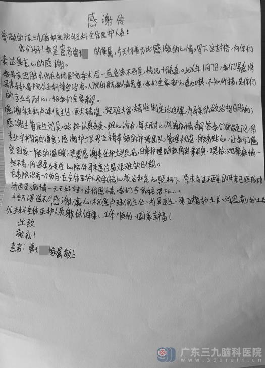 患者来信 联系电话:020-62323939 邮箱:999brain120#163.com (#改@) 【QQ咨询】: 790460929 神经外五科感谢信 http://www.999brain.com 时间:2026-04-10 来源:神经外五科 编辑:srm 阅读:16 上一篇:纸短情长,见字如面 下一篇:神经外五科感谢信 我要评论: 已有0个评论,查看更多评论>> 登录发言| 注册 匿名发言 (无需注册) 请输入验证码 相关报道: 神经外五科感谢信 神经外五科感谢信 纸短情长,见字如面 神经外九科感谢信 神经外九科感谢信 一封来自华润家人的感谢信 神经外十科感谢信 神经外九科感谢信 地址:广州市沙太南路578号 邮政编码:510510 咨询/接诊(24小时):020-62323939(手机:13922111505) 邮箱:sjnkyy@crmedical.hk 传真:86(020) 66299224 官方订阅号 官方服务号 Copyright 2006-2026 广东三九脑科医院版权所有 粤ICP备11100995号 服务性质:非营利性网站 粤卫网审(2013)10号 粤公网安备 44011102002143号
