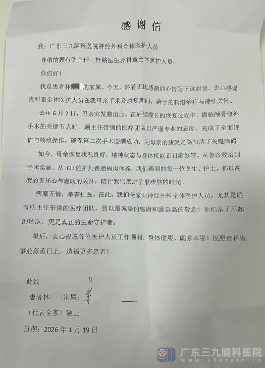 患者来信 联系电话:020-62323939 邮箱:999brain120#163.com (#改@) 【QQ咨询】: 790460929 神经外五科感谢信 http://www.999brain.com 时间:2026-04-10 来源:神经外五科 编辑:srm 阅读:17 上一篇:神经外五科感谢信 下一篇:--敬请期待-- 我要评论: 已有0个评论,查看更多评论>> 登录发言| 注册 匿名发言 (无需注册) 请输入验证码 相关报道: 神经外五科感谢信 神经外五科感谢信 纸短情长,见字如面 神经外九科感谢信 神经外九科感谢信 一封来自华润家人的感谢信 神经外十科感谢信 神经外九科感谢信 地址:广州市沙太南路578号 邮政编码:510510 咨询/接诊(24小时):020-62323939(手机:13922111505) 邮箱:sjnkyy@crmedical.hk 传真:86(020) 66299224 官方订阅号 官方服务号 Copyright 2006-2026 广东三九脑科医院版权所有 粤ICP备11100995号 服务性质:非营利性网站 粤卫网审(2013)10号 粤公网安备 44011102002143号