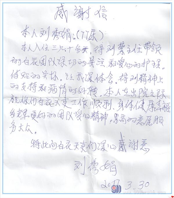 本人刘秀娟,入住三九十多天,得到蔡主任带领的白衣团队深切的关注和爱心的护理。体贴的关怀,让我深体会得到精神上的支持和病情的好转。本人在出院之际祝你们白衣天使工作顺利、身体健康幸福,发挥更好的团队爱心精神,崇高的意愿服务大众。