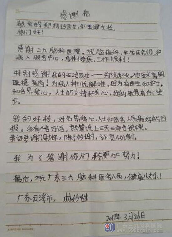 我为了答谢你们,我会更加努力。最后,祝广东三九脑科医务人员健康快乐!