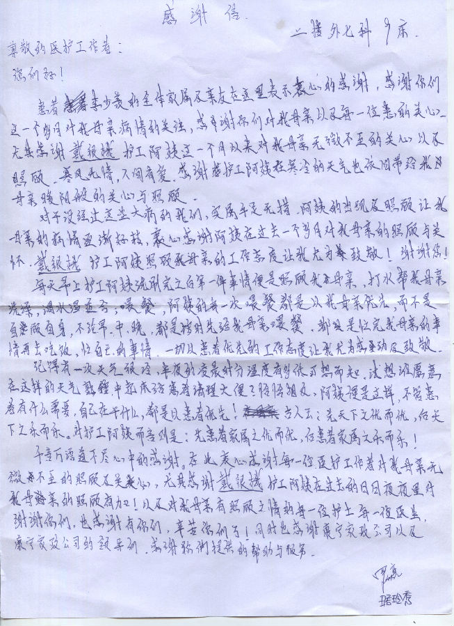 千言万语道不尽心中的感谢。在此衷心感谢每一位医护工作者对我母亲无微不至的照顾及关心,尤其感谢戴银娥护工阿姨在过去的日日夜夜里对我母亲的照顾有加!以及对我母亲有照顾之情的每一位护士,每一位医生。谢谢你们,也感谢有你们,辛苦你们了。同事也感谢康宁家政公司以及康宁家政公司的领导们,感谢你们提供的帮助与服务!
