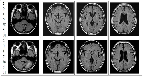 图1患儿2017年5月(第2行)与2016年5月(第1行)头颅MRI T2 flair对比:左侧小脑半球新发病灶、双侧脑干异常信号消失、双侧基底节区异常信号不变、双侧颞顶枕叶皮层区多发异常信号增多或消失。