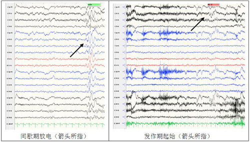 图2间歇期脑电图(左):双侧大脑半球广泛性癫痫样放电。发作期脑电图(右):发作起始无侧向性。参数:低频:1.6Hz;高频:70Hz;敏感度:10μV;
