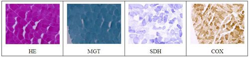 图3 肌肉活检HE染色:所检骨骼肌组织内未见束周肌萎缩。MGT染色:未见镶边空泡和破碎红纤维(RRF),未见肌内神经束;SDH染色:未见破碎蓝纤维和SDH强反应性血管;COX染色:未见COX阴性纤维。