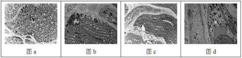 图4电镜下肌纤维膜连续,大部分具有排列整齐的Z线,肌原纤维间有很多电子密度较高、形态未见明显异常的线粒体(图a);肌膜下可见线粒体堆积,但未见巨大线粒体(图b);部分肌纤维细胞核中心移位,核周及肌原纤维间可见大量空泡,以及少量髓鞘样的自噬体(图c);间质中的毛细血管基膜轻度增厚(图b、图c);偶见一个肌纤维的肌原纤维溶解严重,部分肌小节消失,有丝状小体位于核周(图d)。