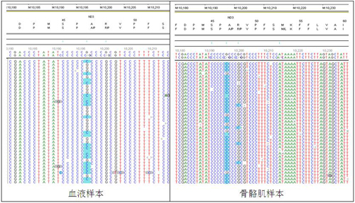 图5血液样本(左图)及骨骼肌样本(右图)中线粒体脑肌病基因检测:ND3基因的两个杂合变异 m.10197G>C 和m.10197delG,在血液标本中突变负荷分别为54.4% 和 5.5%。在骨骼肌样本中突变负荷分别为82.1% 和 8.7%。
