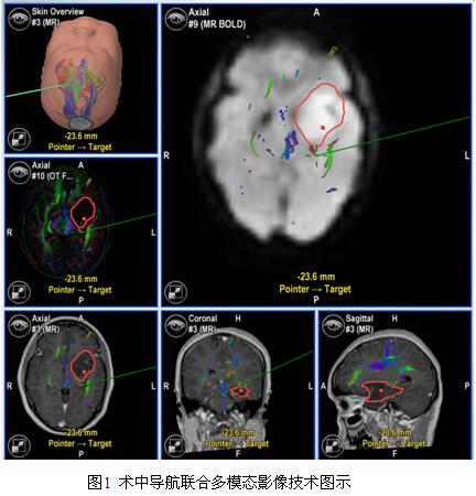 2.病例处理 所有病例均已行开颅切除肿瘤,术前均行MRI平扫增强检测,功能区及功能区附近病变均已行DTI检查,部分病变行MRS、fMRI及脑灌注检查。根据术前影像资料及相关临床数据进行评估,功能区及功能区附近病变符合唤醒条件的经与患者及其家属充分沟通后,行唤醒手术;唤醒麻醉下共切除肿瘤16例,非唤醒麻醉下切除肿瘤31例。所有病例行术中导航联合多模态影像技术(图1),部分病例还运用了术中荧光、术中B超等手段。术后48小时内均已行MRI平扫及增强检查。