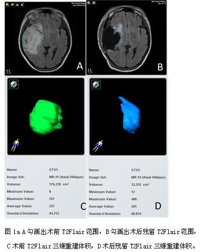 3. T2Flair术前、术后及切除范围计算方法 收集患者术前、术后48小时内MRI-Flair图像,术前、术后MRI图像导入德国Brainlab计划系统,采用Brainlab-iPlan软件定量计算术前、术后残余T2Flair体积(如图1a),并计算出T2flair 切除程度。