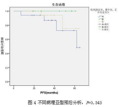 2.随访及预后 随访截止2017年3月1日,中位随访时间37月(18月~65月),7例失访, 6例复发,2例死亡,5年无进展生存率80.2%(图2);生存预后的单因素分析结果如图3~图7示。