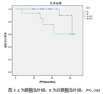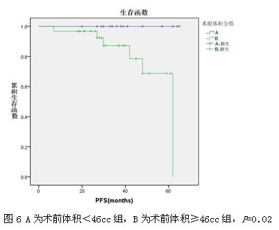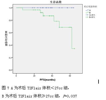 本研究中,单因素分析结果提示年龄<45岁组与≥45岁无进展生存预后无明显差异;低级别胶质瘤的病理亚型的无进展预后亦无明显区别;但位于额颞岛叶的肿瘤的无进展生存时间明显短于非额颞岛叶,这或许与额颞岛叶的肿瘤造成了相对严重的神经功能损伤所致;对肿瘤术前体积分析的结果显示术前体积<46cc组的无进展生存期明显好于术前体积≥46cc组;术后残余体积<27cc组无进展生存期明显好于而术后残余体积≥27cc组。以上结果显示出肿瘤是否位于重要功能区、术前肿瘤的大小、术后切除体积是影响低级别胶质瘤无进展生存预后的重要因素。