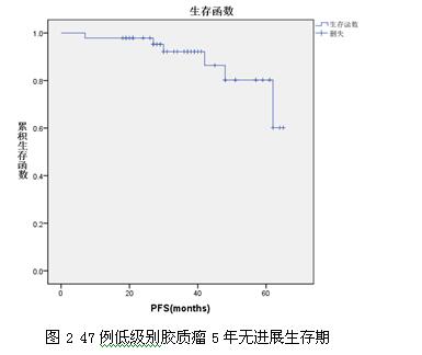 方法:回顾性分析广东三九脑科医院2011年10月份至2015年9月病理确诊的47例WHO II级胶质瘤病例,所有病例采取了唤醒麻醉或非唤醒方式开颅切除肿瘤,术后均接受辅助放疗。收集患者术前、术后48小时内MRI-Flair图像,用Brainlab-iPlan软件定量计算术前及术后残余T2Flair体积。采用SPSS20.0统计软件进行生存分析,Kaplan-Meier法计算无进展生存率并行log-rank检验。