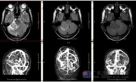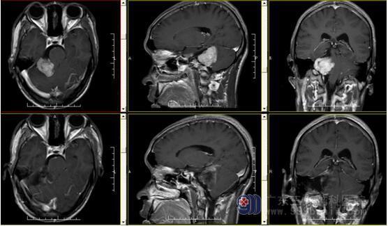 术前MR报告示右侧桥小脑角区示一团块状长T1稍长T2信号影,FLAIR序列呈等信号,大小约47mm×32mm×35mm;增强后呈明显强化,邻近右侧听神经增粗、强化;邻近右侧小脑半球示斑片状长T1长T2信号影,FLAIR序列呈高信号。