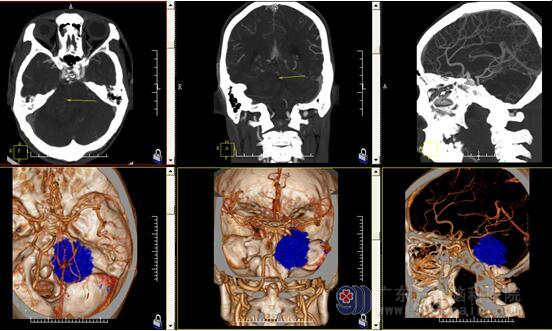 术前CTA检查示右侧桥小脑角区占位性病变内示少许小血管影,邻近右侧大脑后动脉受推挤,相应内听道明显扩大,右侧桥小脑角区占位性病变内存在少许小血管,考虑为听神经鞘瘤可能。