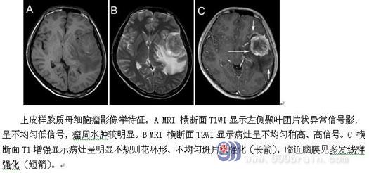 上皮样胶质母细胞瘤(Ep-GBM)好发于儿童及青少年,典型发病部位为大脑表面,好发于颞叶近脑表面,肿瘤一般为单发,呈囊实性,病灶不规则形,边缘清晰,MRI检查T1WI呈稍低信号,T2WI呈不均匀高信号,囊变时为明显高信号,实性成分较多时呈等、稍高信号。增强扫描明显不规则斑片或环形强化,占位效应明显,周围可见明显瘤周水肿带。早期出现软脑膜播散,形成软脑膜强化是与经典型胶质母细胞瘤的重要鉴别点。需与多形性黄色星形细胞瘤、巨细胞型胶质母细胞瘤、胚胎源性肿瘤等肿瘤鉴别。