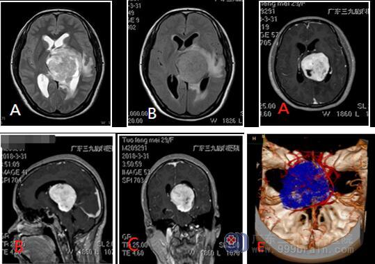 手术方式及疗效 手术经侧脑室三角区入路,术中见脑室内占位,因术前栓塞后,肿物表面供血丰富,质脆,与周围组织界限清楚,分块切除肿物,仔细保护脑组织和血管,镜下全切肿物,送病理。术后患者恢复良好,伤口I期愈合后出院,未出现新增神经功能缺失。予以常规放疗。目前患者病情稳定,随访中。