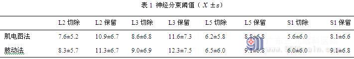 1.4 统计学方法:应用SPSS 19.0软件进行统计学分析,所有神经分束均记录两种方式所监测的阈值,分为肌电图法和肢动法两组,并两两行配对T检验分析,p<0.05为差异有统计学意义。