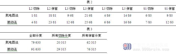 2.2 监测中如20mA刺激方有或仍无肌电图动作电位或肢动收缩则记为阴性。所有神经分束肌电图法阴性率为79/630,肢动法阴性率为91/630。详见表2、表3: