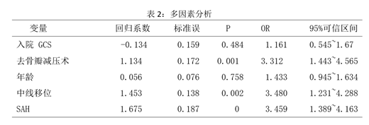 统计分析:使用 SPSS17.0软件进行统计学分析,先行单因素分析,采用卡方检验分析计数资料(表1);再采用Logistic多因素回归分析,因变量为无硬膜下积液=0,有硬膜下积液=1;无脑积水=0,有脑积水=1(表2)。自变量取值方法如下:GCS 评分 3-8分=1,<3分=2,无去骨瓣减压=0,去骨瓣减压=1;年龄<50 岁=1,年龄≥50 岁=2;无中线移位=0,中线移位=1;无 SAH=0,SAH=1。检验水准为α=0.05。
