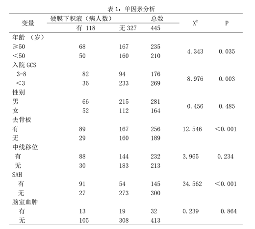 结果:硬膜下积液118例, GCS3~8 分者有82例,GCS<3分者有36例;行去骨瓣减压术者89例, 未行去骨瓣减压术者29例;中线移位88例, 中线无移位30例;合并蛛网膜下腔出血91例,无蛛网膜下腔出血27例;合并脑室血肿13例,无脑室血肿105例。单因素分析发现年龄、入院时 GCS、去骨瓣减压术、中线移位、是否合并蛛网膜下腔出血与硬膜下积液有关(见表1);