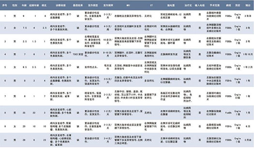 1.1 一般资料 男性 7 例,女性 3 例。年龄 2 岁半至 29 岁,平均 12 岁。病程:1 年至 23 年不等,平均为 6 年 8 个月。均行正规抗痫药物治疗,2 例加行免疫抑制剂(西可莫司)治疗,一例加行生酮饮食治疗,效果均不佳(详见表 1)。