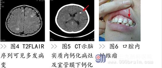 由于结节性硬化个体之间的临床表现差异巨大,诊断有一定挑战性。2012 年在美国华盛顿由来自 14 个国家的 79 名专家制定了结节性硬化诊断的专家共识 :A. 基因诊断标准 :正常组织 DNA 检查确定有 TSC1 或 TSC2 基因突变即可确诊结节性硬化。必须注意的是 10-25% 的结节性硬化患者通过常规基因检查不能确诊。因此,结果正常不能排除诊断。B. 临床诊断标准:主要特征:1、3 个或 3 个以上直径大于 5 毫米的色素脱失斑(图 1),2、3 个或 3 个以上的血管纤维瘤(图 2)或额部纤维结节,3、2 个或 2 个以上指甲周围纤维瘤(图 3),4、鲨革斑,5、视网膜多发错构瘤,6、皮质发育不良(图4),7、室管膜下小瘤(图 5),8、室管膜下巨细胞星型细胞瘤,9、心脏横纹肌瘤,10、淋巴管平滑肌增多症,11、2 个或 2 个以上的血管肌脂瘤 ;次要特征 :1、皮肤“斑驳样”改变,2、3 个或 3 个以上的牙釉质小凹,3、2 个或 2 个以上的口腔纤维瘤(图 6),4、视网膜色素脱失斑,5、肾多发囊肿,6、非肾性错构瘤。有 2 个主要特征或一个主要特征加两个次要特征可确诊 ;具备 1 个主要特征或两个及以上次要特征则疑似。