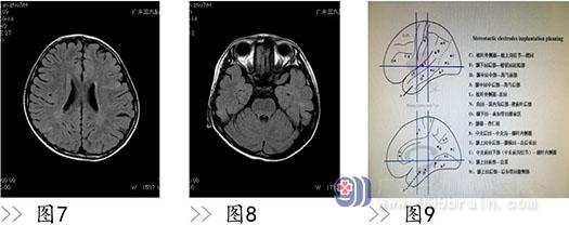 而在手术治疗方面,由于颅内结节病灶往往多个,皮层及皮层下、室管膜下均可累及,明确具体致痫灶是一个巨大挑战。必须指出的是 :虽然结节性硬化患者颅内结节往往较多,但并不是每一个结节都有内源性致痫性。在上世纪 90 年代,电极植入技术作为确定致痫灶的金标准被确定下来。如果经评价电极植入风险不高,患者经济情况允许,可疑致痫灶位于功能区需进行功能 Mapping,则电极植入后再手术应该是首选的策略。但是,由于相应的手术风险和较大花费,所有患者均行电极植入后再行切除性手术治疗并不太现实。术中皮层电极监测下剪裁式切除痫样放电区作为上世纪 90 年代前的标准,其核心是对刺激区的切除,有可能是一种扩大化的切除,虽然有一些缺点,比如麻醉药物的干扰,甚至误导致痫灶的范围,但是在麻醉科的良好配合及手术病人的合理选择下效果还是不错的。本组病人中 7 例患者因经济较困难,不能进行电极植入手术,但是在术中皮层电极监测下进行手术治疗其中 6 例也取得了不错的效果。我们的经验是无创性检查已有明确的脑区指向性,且相应脑区位于非功能区,该脑区的结节位于大脑凸面能够很好覆盖皮层电极进行术中监测的情况下,这种手术策略还是效果不错的。原则上,电极植入后明确致痫灶范围再进行手术切除的疗效应该优于术中皮层电极监测下的切除手术疗效。既往有基于电极植入后的研究证实结节病灶内是有致痫性的,也有研究认为致痫性位于结节病灶周围,还有研究认为结节病灶及其周边都有明确致痫性。本组病例中 3 例行 SEEG 监测,也证实致痫灶均大于皮层结节范围。因此在手术前,必须进行仔细的术前评估,包括详细的影像学检查,视频脑电图检查,症状学分析,必要时,应进一步行侵入性电极检查(图 7-11)。