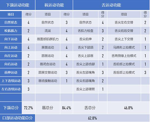 口部运动:目前存在下颌咬肌力量不足,下颌分级调控障碍,唇运动欠佳,唇舌协调欠佳,舌运动靠后。