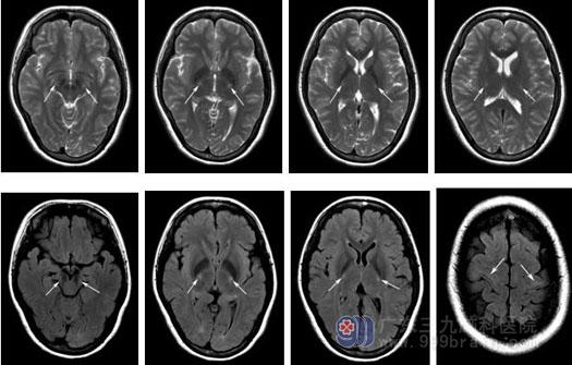 ▲神经影像学检查:头颅MRI: 双侧皮质脊髓束、双侧额叶中央前回皮层下白质对称性T2WI及FLAIT序列异常高信号。