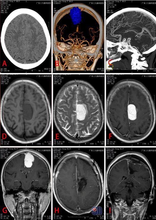 方法 我科接诊1位61岁女性患者,头颅CT及MR检查提示左侧额部镰旁一个4.0 ×3.7×2.6cm占位性病变,在显微镜下行肿瘤切除术,术后行HE染色和免疫组化分析。