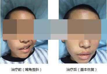 患者男,23岁,周围性面神经炎,主要症状为嘴角歪斜,伴有轻度抬眉毛不能。
