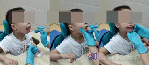 下颌:红色T字牙胶双侧进行30-50次,分级调控训练(a/o/i),高低位转换发音:阿姨,娃娃,妈咪。