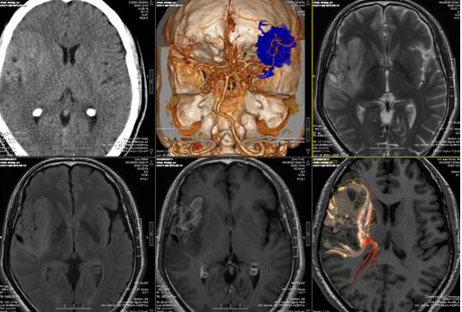 患者陈某,男性,50岁,1周前出现左侧肢体麻木,就诊地医院查复查头颅CT提示:右侧额颞岛叶肿瘤,肿瘤包绕颅内大血管,当地医院建议转院治疗。家属多方打听后就诊于我院门诊。此时的患者精神差,懒言少语,给予安排住院,继续给予完善后续检查明确诊断与治疗。