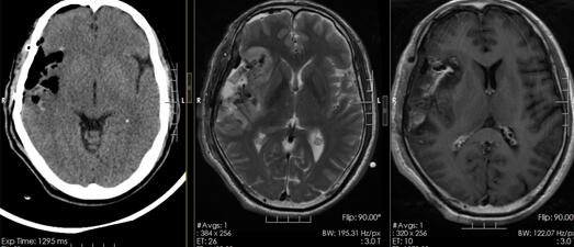 检查:患者入院后查体:神志清楚,对答切题,双侧瞳孔等大等圆直径2.5mm,对光反射灵敏,四肢肌力5级,肌张力正常,生理反射存在,病理反射未引出。我院 3.0TMR颅脑平扫, MR弥散成像全套(DWI)检查意见: .右侧额颞岛叶-放射冠占位性病变,结合MRS,考虑高级别胶质瘤,胶质母细胞瘤或间变性星形细胞瘤可能性大;病灶包绕右侧大脑中动脉主干及分支,邻近柔脑膜存在脑膜转移可能;2.弥漫性轻度脑萎缩。