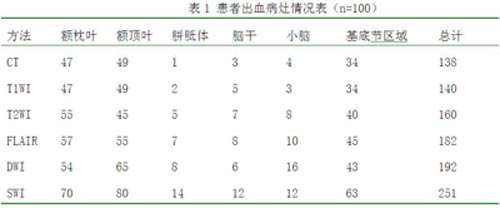 通过本次研究结果表示,采用CT发现有138个出血病灶,采用MRI检查T1WI有140个出血病灶,T2WI有160个出血病灶,FLAIR有182个出血病灶,DWI有192个出血病灶,SWI有251个病灶。同时,以额枕叶和额顶叶以及基底节区域出血最多。采用CT平扫出血病灶表现为高密度或等高密度;采用MRI进行检查,出血病灶表现为不规则斑点状、索条状、圆点状异常信号。详细情况见下表1。