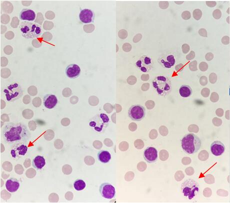 细胞学诊断:脑脊液细胞学呈淋巴-中性粒细胞为主的混合细胞反应型,未见明显异型细胞,中性粒细胞胞浆空泡多见,结合病史,感染的可能性大(见图1)。