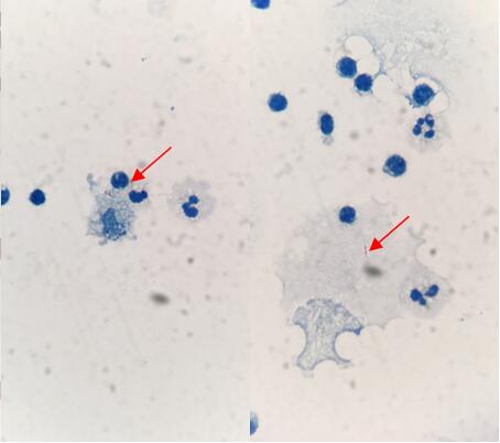 结果分析:离心后上清微黄,不支持单纯损伤出血;出血是肯定的,但考虑损伤带入可能性大,因为细胞学未发现红细胞吞噬细胞及含铁血黄素吞噬细胞或胆红素吞噬细胞;感染合并出血不大支持,理由是未见红细胞吞噬细胞等;考虑感染可能性大,理由是病人白细胞计数明显升高,有发热、头痛等中枢神经系统感染症状支持。中性粒细胞28%不考虑出血带入影响,现由是正常情况下,脑脊液中不存在红细胞,如为穿刺损伤,白细胞将会与红细胞成比例的进入,根据外周血红白细胞的比例关系,1638的红细胞只能带入几个白细胞,而不可能是122。