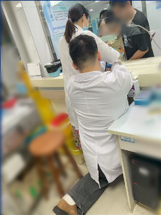 那天,一位门诊患儿在父母陪同下前来采血,孩子对针头充满恐惧,始终不愿配合采血。邓晓燕护士耐心蹲下身,用温柔的话语和卡通贴纸慢慢安抚,一点点消解孩子的不安,终于让他愿意伸出小手。可采血窗口空间狭窄,无法两人并排操作,为了让邓晓燕能顺利采血,也为了防止孩子在过程中因害怕而挣脱,一旁的赖可元同志没有丝毫犹豫,毅然双腿跪在了冰凉的地面上。他微微弓着身子,双手稳稳托住患儿的手臂,既给了孩子足够的安全感,又为邓晓燕留出了精准操作的空间。整个过程中,他始终轻声安抚着孩子:“别怕,叔叔扶着你,很快就好啦。” 在医护与家长的默契配合下,采血顺利完成,孩子没有哭闹,家长脸上也露出了欣慰的笑容。这一跪,没有惊天动地的声势,却在方寸之间尽显医者仁心。在检验科,我们始终相信,服务的温度从来不在宏大的叙事里,而在这些具体的选择中:是面对恐惧患儿时多花十分钟的耐心引导,是狭窄空间里甘愿跪地的主动担当,是为了让患者少一分不安而多做的每一个细节。