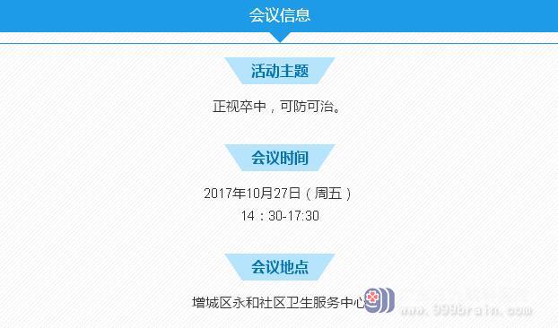 10月29日是世界卒中日,为响应党中央“两学一做”的号召及中国卒中联盟积极开展红手环活动的政策,广东三九脑科医院神经内二科及神经外六科将在世界卒中日联合增城区永和社区卫生服务中心举行基层医生脑血管病培训活动。