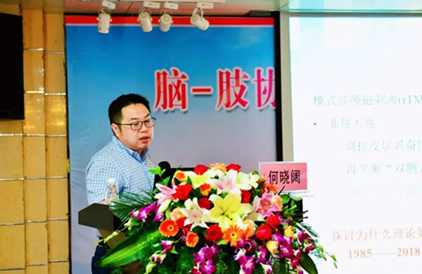 湖北医药学院康复医学系何晓阔副教授从TMS的理论基础及多年的丰富临床经验出发,进行了题为《TMS及其在神经康复中的运用》的详细报告。