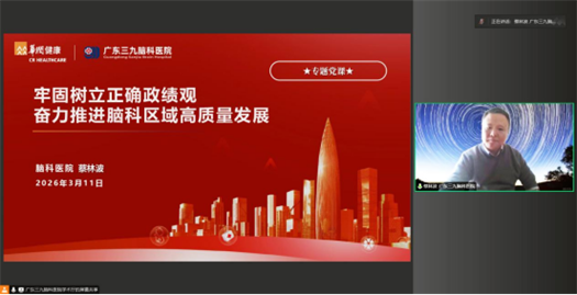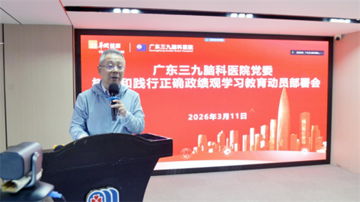 党委书记蔡林波作《牢固树立正确政绩观 奋力推进脑科区域高质量发展》专题党课,并部署广东三九脑科医院学习教育工作。他指出,我院正处于“十五五”转型创新的关键期、深化医改的攻坚期,要以这次学习教育为契机,进一步树立和践行正确政绩观,为医院转型创新和高质量发展贡献更多力量。他强调,牢固树立正确政绩观,要始终坚持正确的政治方向,全面加强党的建设;要始终坚持以人民为中心,践行为民服务宗旨;要始终坚持以上率下,力戒形式主义和官僚主义;要始终坚持担当实干,努力推动高质量发展。