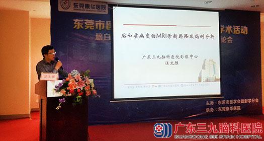 2016年4月9日,我院影像诊断中心汪文胜主任应东莞市医学会放射学分主委、东莞市人民医院放射科郑晓林主任邀请出席了由东莞市医学会放射学分会主办康华医院承办的脑白质病变MRI诊断学术讲座暨一季度讨论会会并做学术演讲,汪文胜主任演讲的讲座题为《脑白质病变的MRI诊断思路及病例分析》,讲座对于脑白质病这一定义广泛的疾病进行了归类,对诊断思路进行了梳理,并结合大量病例包括常见病、少见病及罕见病针对性地讲解,讲座博得了在场同道的热烈好评。