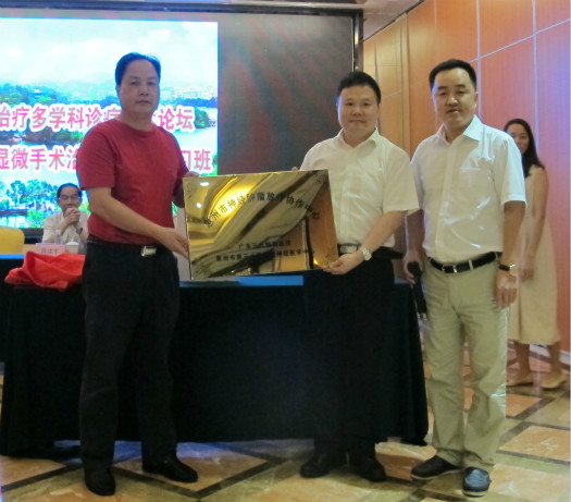 会议宣布惠州市第三人民医院神经医学中心与我院肿瘤综合治疗中心联合成立“惠州市神经肿瘤放疗协作中心”并举行揭牌仪式,马显力院长、蔡林波主任及李雪松主任共同揭牌并合影留念。