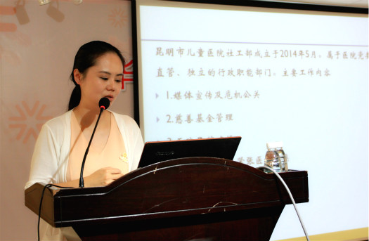 最后她介绍这半年来慈善基金救助的情况,包括对先天性心脏病、马蹄足病等疾病的救助。她强调昆明市儿童医院的志愿者服务采取社工+志愿者的模式推动服务的专业化发展。