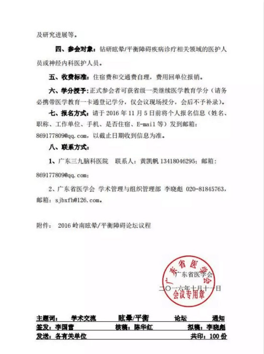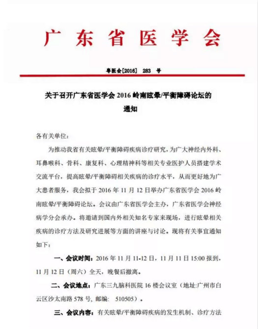 为推动我省有关眩晕/平衡障碍疾病诊疗研究,为广大神经内外科、耳鼻喉科、骨科、康复科、心理精神科等相关专业医护人员搭建学术交流平台,提高眩晕/平衡障碍相关疾病的诊疗水平,从而更好地为广大患者服务,广东省医学会将于2016 年 11 月 12 日在我院举办广东省医学会 2016 岭南眩晕/平衡障碍论坛。