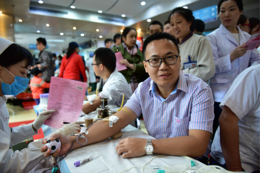 广州市血液中心中心副主任梁华清对我院员工积极参与献血表示衷心的感谢,他指出广州长期排在全国城市无偿献血量第二位有赖于社会各界积极承担应尽的社会责任,他希望通过我院医护人员这种大爱的精神将爱心延续到社会的各个角落。