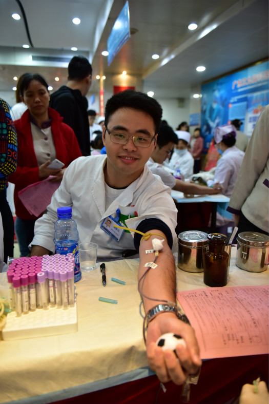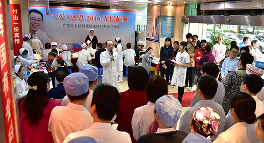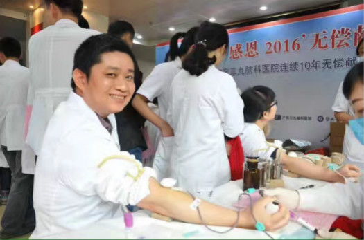 11月10日,我院住院大厅人声鼎沸,身穿白大褂的医生和护士们在这个“大爱•感恩”2016年无偿献血暨广东三九脑科医院连续10年无偿献血活动现场,再次伸出手臂献出了鲜红的热血。
