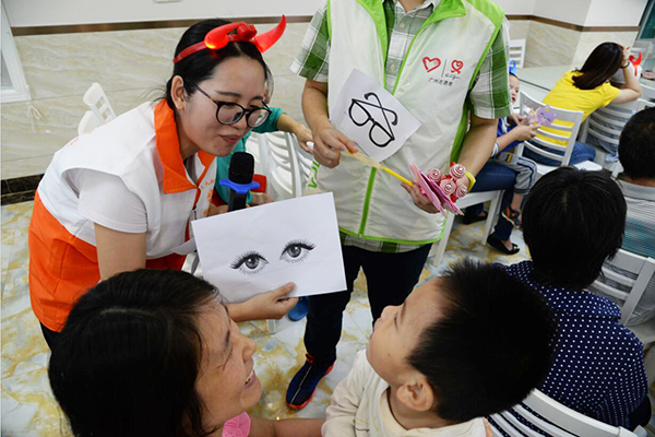 润心志愿者婷婷老师主持活动,她以猜谜语作为开场活,引出今天的主角“眼睛”,随后她详细介绍了眼睛的知识,并和志愿者们通过舞台剧的形式讲述了眼睛和鼻梁的故事,告诉小朋友们要爱护眼睛。为了满足小朋友们的求知欲,她特意教他们学做眼睛小体操。